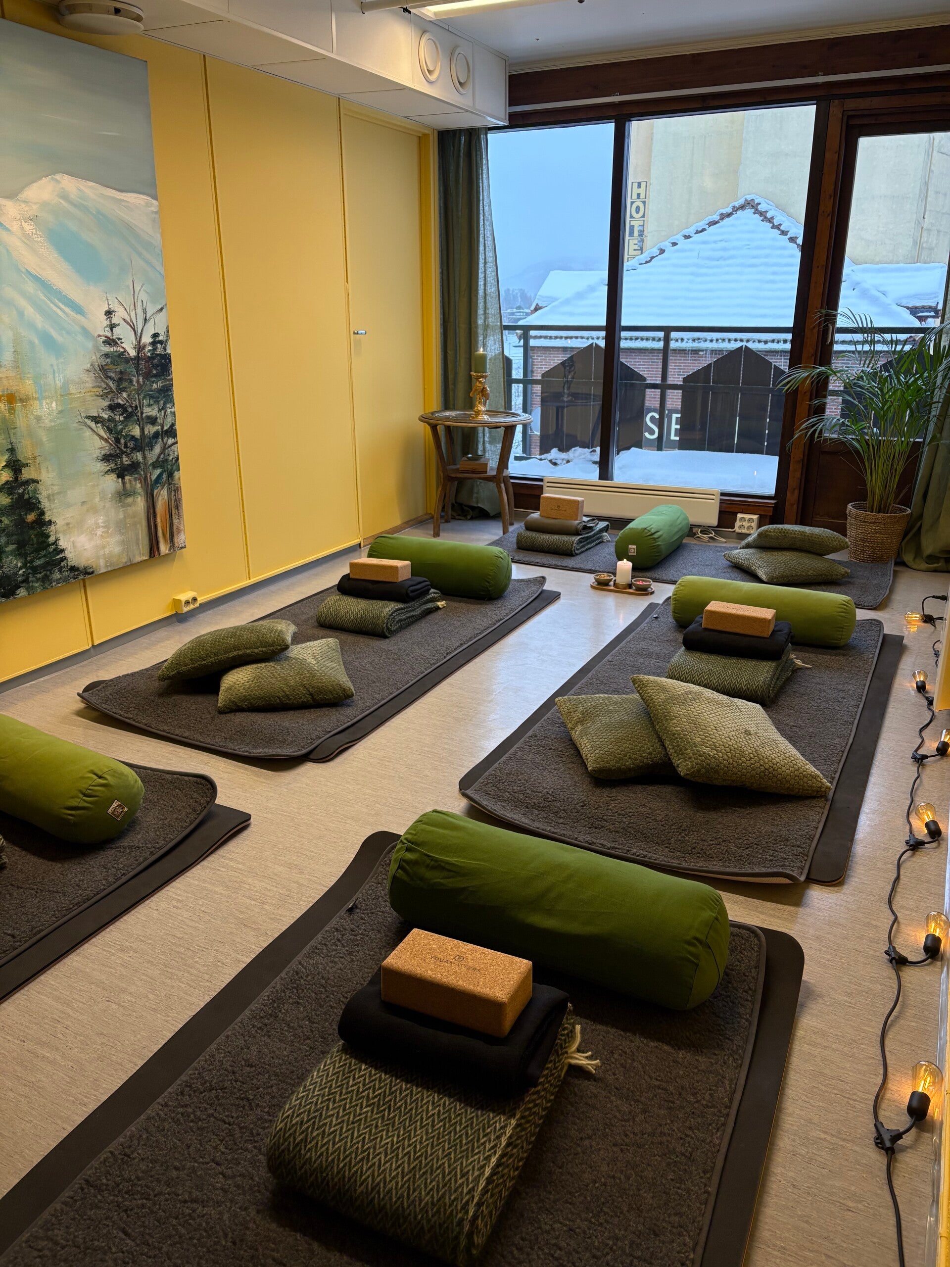 Rommet er varmt og trygt, med ullmatter, tepper og puter som støtter kroppen i avspenning.